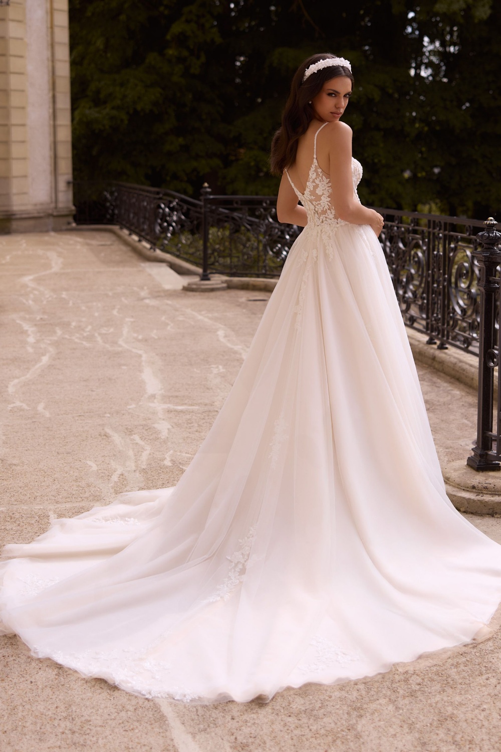 La robe de mariée Amarante incarne la grâce et la féminité à l'état pur. Son bustier transparent en dentelle florale, travaillé avec finesse, met en valeur la silhouette tout en jouant avec la délicatesse des bretelles fines. Légèrement cintrée à la taille, elle s'évase dans une jupe fluide en tulle orné de motifs brodés, offrant un tombé aérien et raffiné. Le dos nu, subtilement dessiné, apporte une touche de sensualité tandis que la traîne majestueuse souligne toute l'élégance de ce modèle. Equilibre parfait entre romantisme et modernité, la robe Amarante s'adresse à la mariée qui rêve d'une allure lumineuse et intemporelle pour le plus beau jour de sa vie.