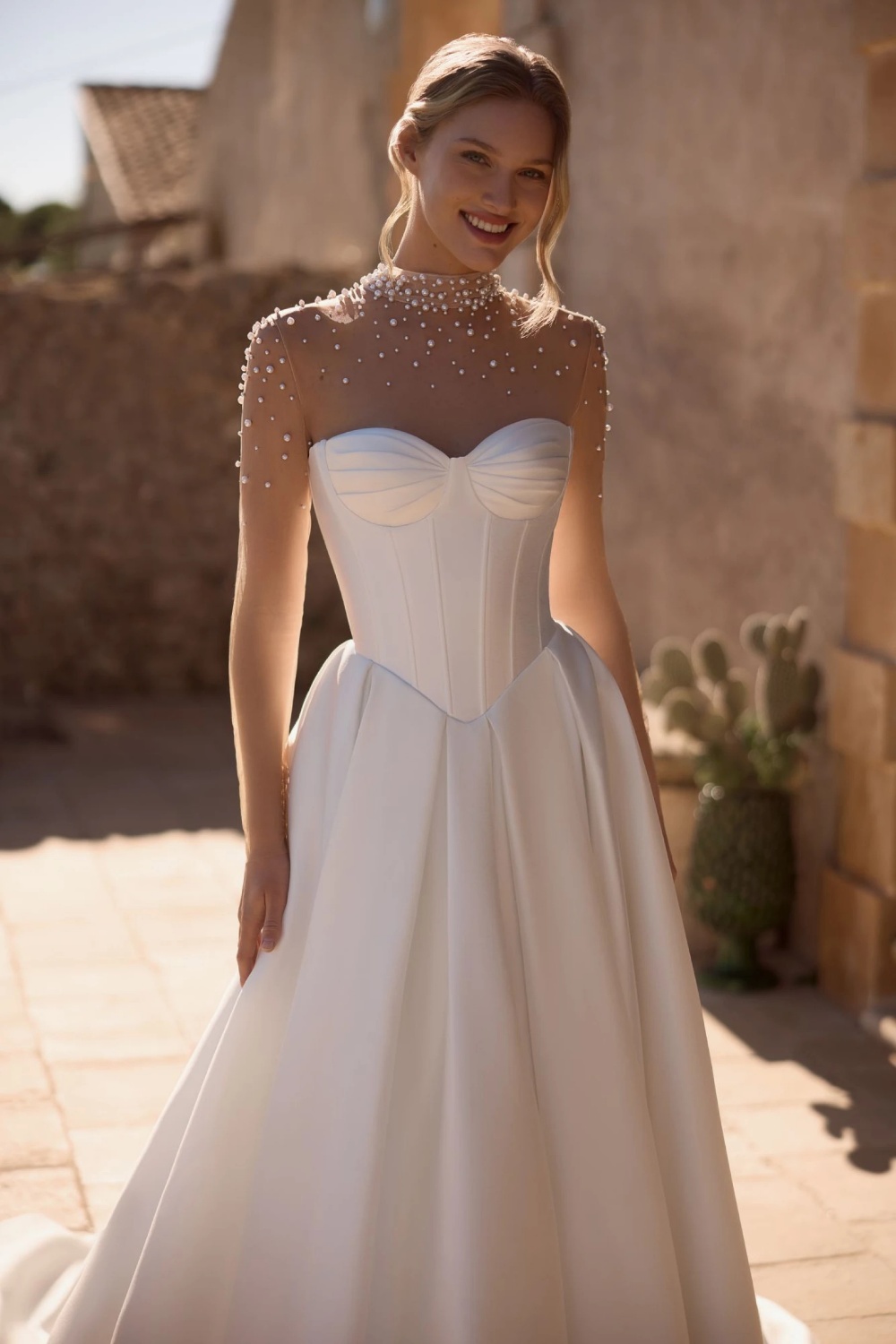 Eclatante et unique, la robe Ara séduit par son alliance parfaite entre modernité et romantisme. Son corset structuré, au décolleté cœur revisité, dessine une silhouette féminine et élégante, tandis que sa jupe ample en mikado offre un volume majestueux digne des plus beaux contes de fées. Les détails qui font tout son charme : Un corsage couture à la structure délicate, pour une mise en valeur naturelle de la poitrine. ( vendue à part, comme un accessoire complémentaire ) : Une encolure illusion ornée de perles délicatement brodées, qui apporte une touche poétique et lumineuse. Une belle jupe en mikado volumineuse, accompagnée d'une traîne élégante pour une allure impériale. La robe Ara est le choix idéal pour la mariée qui souhaite une allure à la fois princesse contemporaine et femme affirmée, avec un éclat inoubliable.