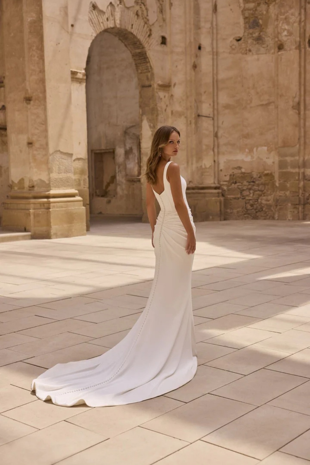 La robe Helena sublime l'élégance minimaliste avec une allure moderne et intemporelle. Confectionnée dans un crêpe d'une fluidité exceptionnelle, elle épouse délicatement les courbes pour une silhouette élancée et raffinée. Les détails qui font la différence : Un décolleté carré structuré qui met en valeur le port de tête et la féminité. Une taille délicatement drapée qui souligne la silhouette avec subtilité. Un dos profond et élégant, sublimé par une longue rangée de boutons recouverts. Une traîne fluide qui apporte grâce et solennité à chaque pas. Sobriété et modernité s'allient pour faire de la robe Helena le choix idéal de la mariée qui souhaite rayonner avec un style simple , chic et intemporel