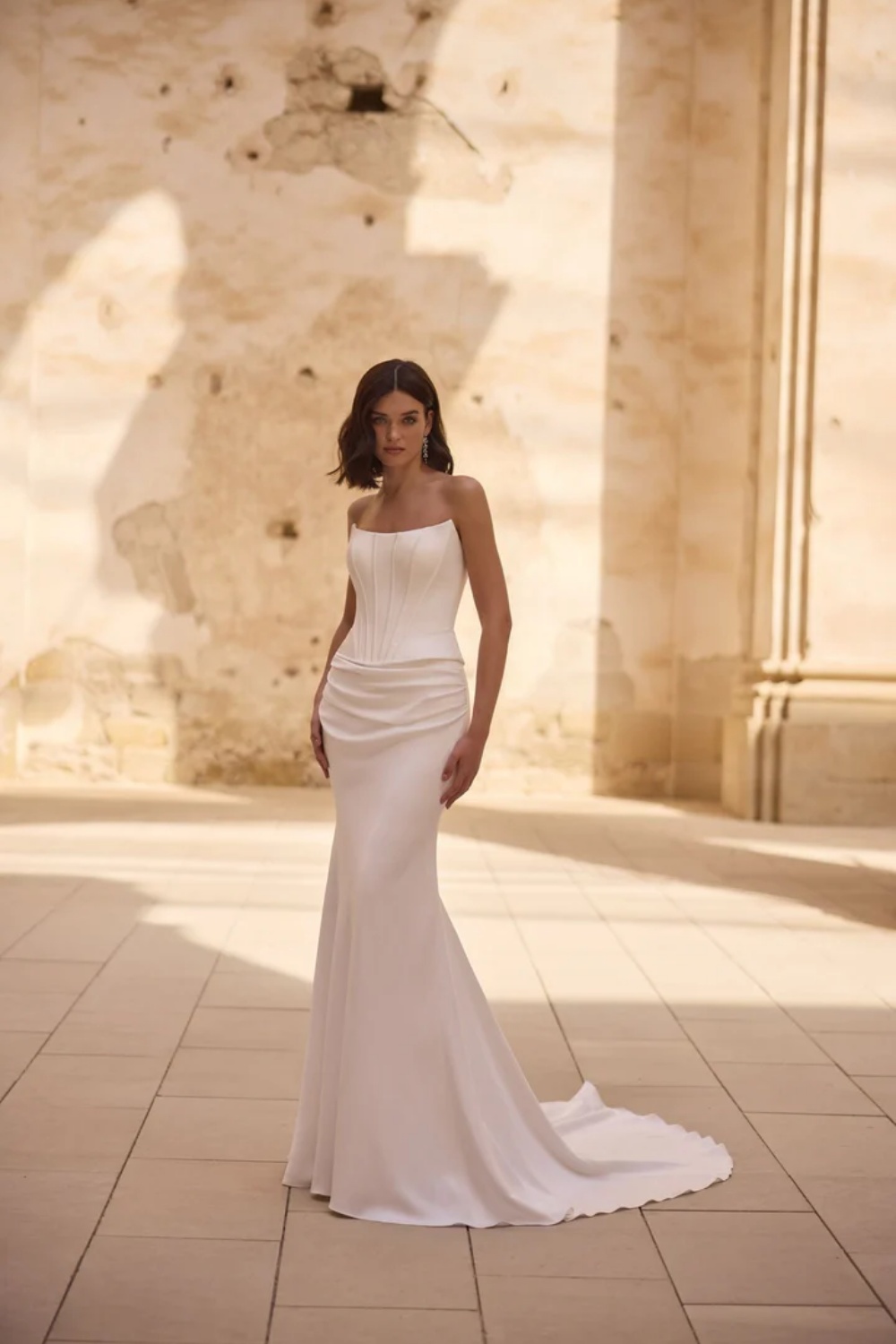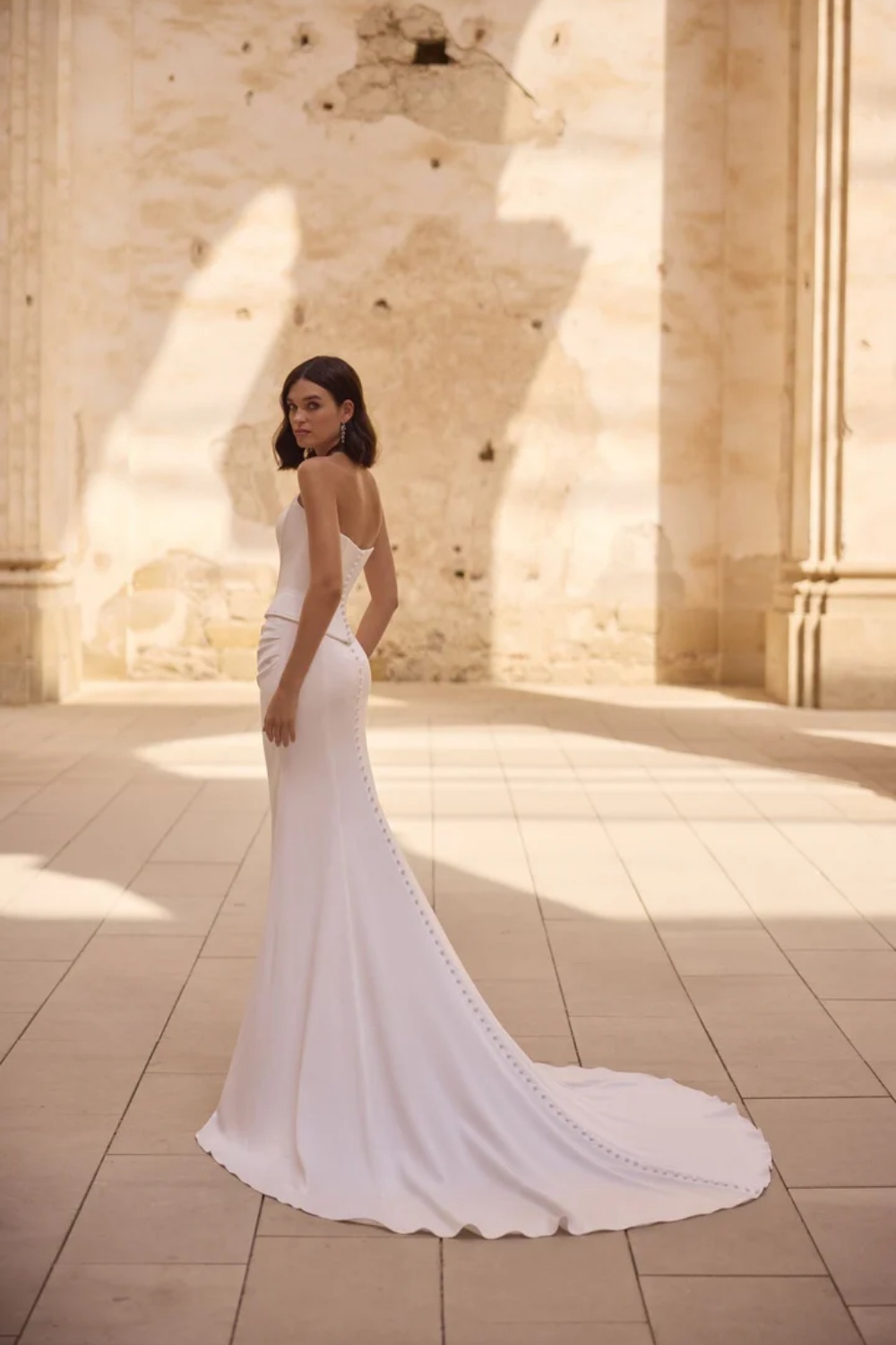 Elégante et contemporaine, la robe Honorine séduit par son allure couture et sa modernité. Confectionnée en satin somptueux, elle joue avec la tendance du deux- pièces pour une silhouette à la fois affirmée et féminine. Les détails qui subliment Honorine : Un bustier structuré au tombé impeccable, qui souligne le buste avec raffinement. Un taille délicatement drapée qui allonge et met en valeur la silhouette. Une jupe sirène en satin, fluide et légèrement satinée, terminée par une traîne élégante et une rangée de boutons recouverts. Un effet deux- pièces subtil et moderne qui apporte un charme unique. La robe Honorine s'adresse à la mariée qui souhaite un style sophistiqué et résolument moderne, tout en conservant l'élégance intemporelle du satin.