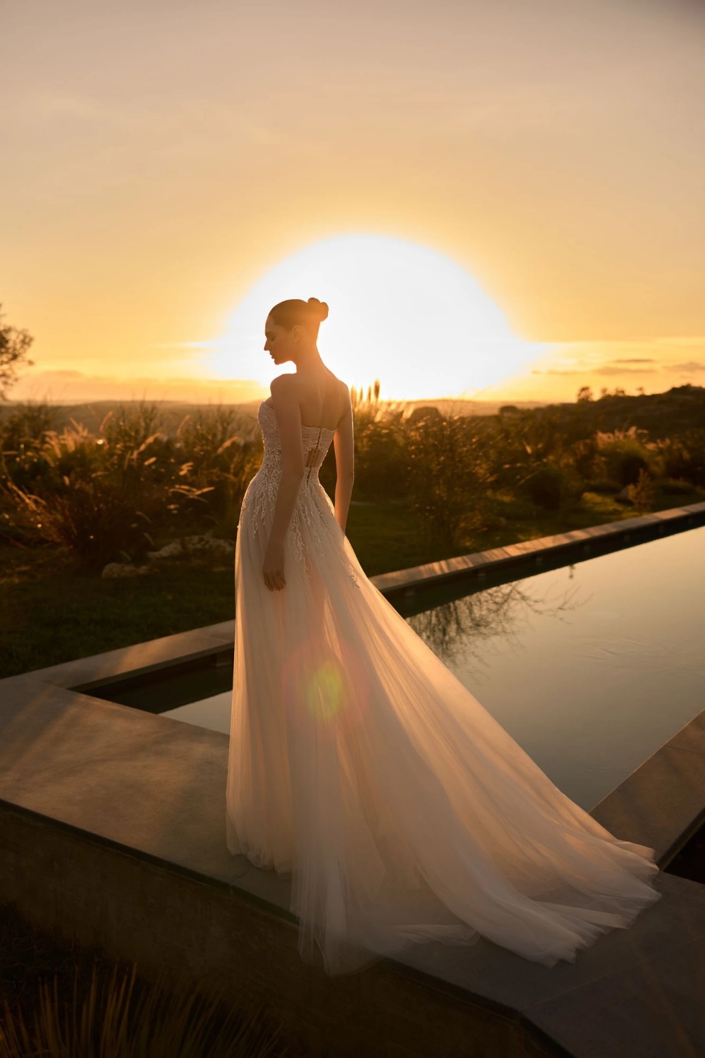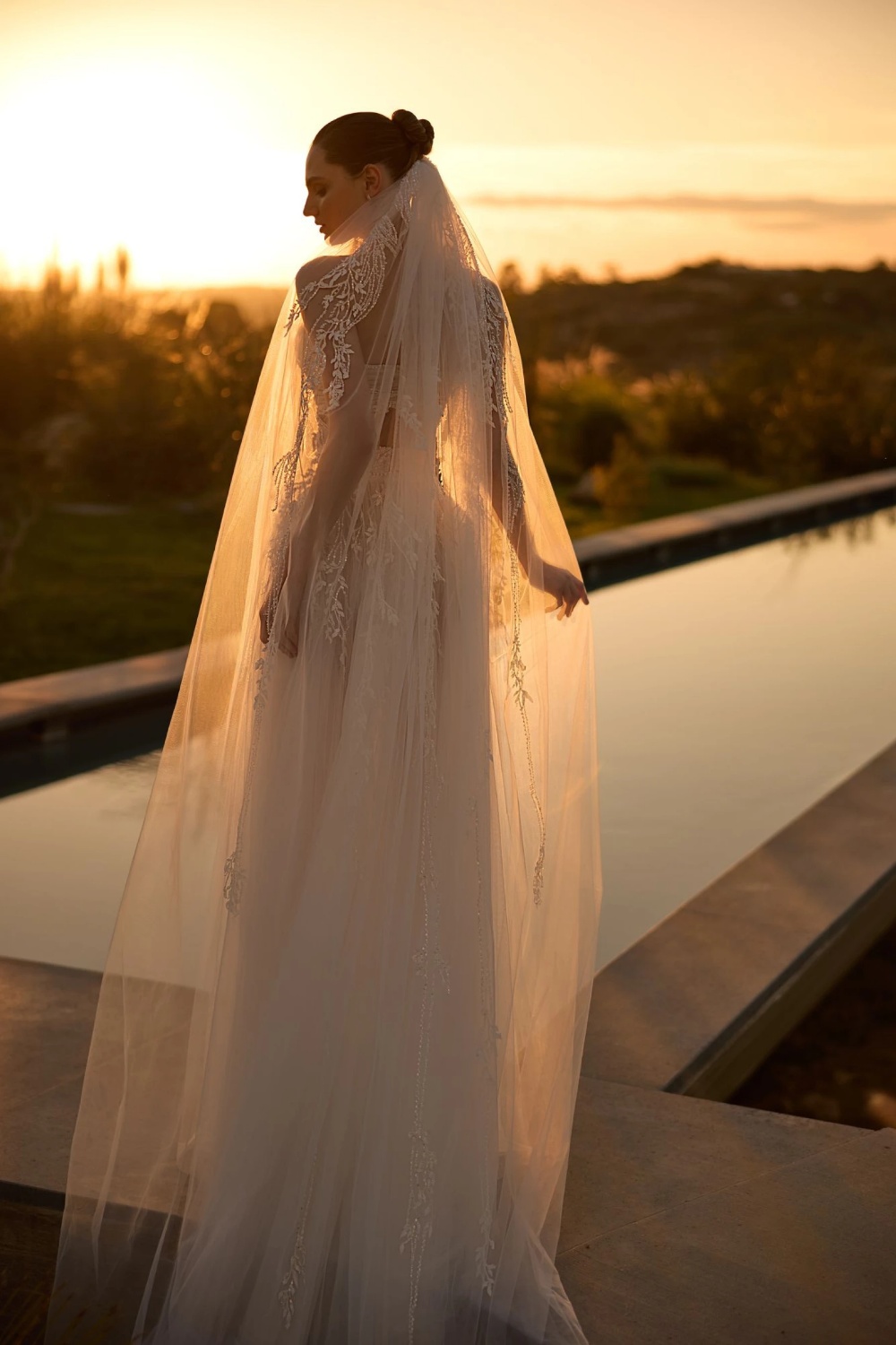 Evanescente et envoûtante, la robe Hypnotic captive par sa fluidité et sa modernité. Confectionnée en tulle aérien, elle offre une légèreté incomparable et un mouvement presque magique à chaque pas. Les détails qui la rendent unique : Un corsage travaillé façon bustier, délicatement orné de jeux de drapés et de broderies raffinées. Une taille soulignée par des découpes modernes qui subliment la silhouette. Une jupe en tulle fluide, vaporeuse, vaporeuse et élégante, disponible en boutique dans une version non transparente pour plus de confort et de discrétion. Une allure résolument contemporaine qui mêle sensualité et élégance intemporelle. La robe Hypnotic est idéale pour la mariée qui ose la modernité tout en conservant une grâce romantique, portée par la fluidité d'un tulle aérien.