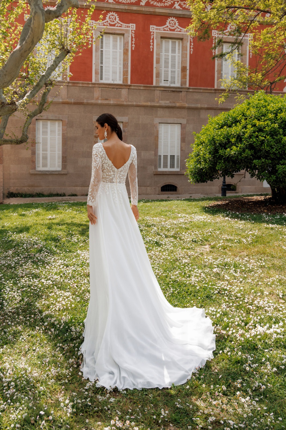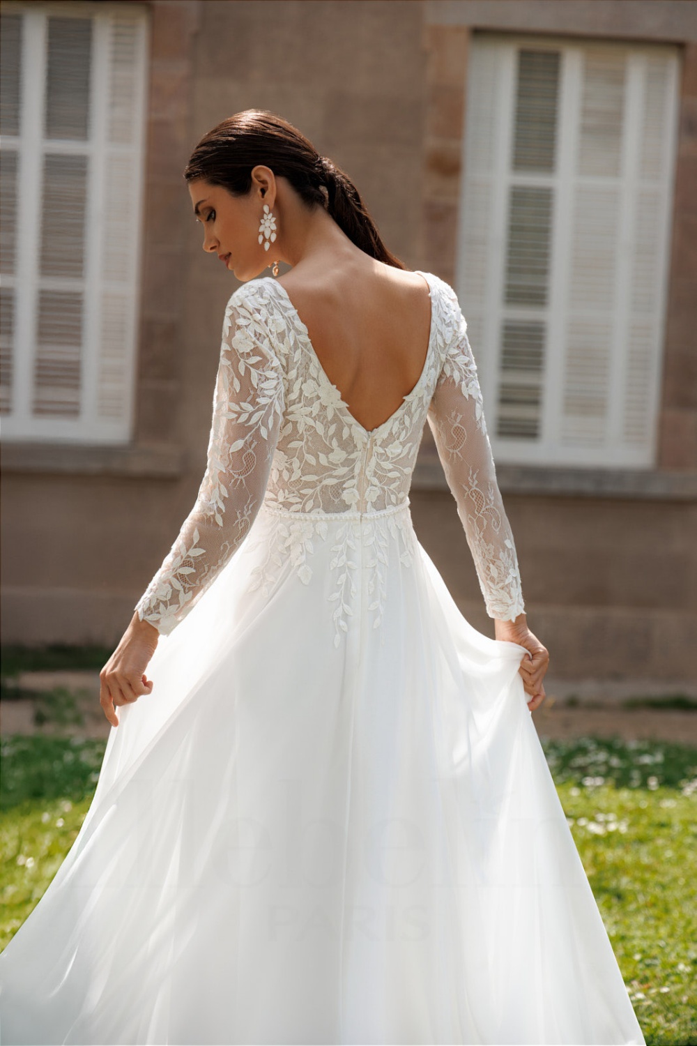 La robe de mariée Zina incarne la grâce et l'élégance intemporelle. Son bustier en dentelle délicatement brodée de motifs floraux se prolonge par des manches longues en tulle transparent, apportant à la fois romantisme et raffinement. Le décolleté en V, à l'avant comme à l'arrière, sublime la silhouette avec justesse et féminité. Sa jupe fluide en mousseline légère offre un tombé aérien et poétique, idéal pour une mariée en quête d'un look naturel et sophistiqué à la fois. Chaque mouvement révèle toute la douceur et la légèreté de ce modèle, parfait pour un mariage empreint de romantisme. La robe Zina s'adresse aux mariées qui souhaitent allier confort et élégance, en mettant en avant une silhouette harmonieuse, subtilement mise en valeur par la transparence raffinée de la dentelle et la pureté d'une jupe épurée.